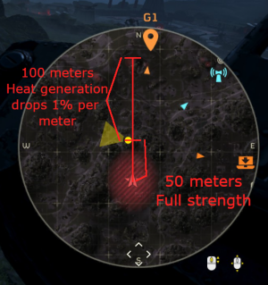 The center of the Area of Influence is the Element's icon on the map. The amount of Heat generated scales based on a Player's distance from that center. Within 50 meters, Heat Generation is at its maximum value and then it has a "Falloff" that extends out to 150 meters and the strength of the Heat Generation decreases by 1% per 1 meter. For example, if you are 100 meters from the Icon, the Heat Generation will be at 50% strength. At 75 meters, it's at 75% strength. At 125 meters, it's at 25% strength.